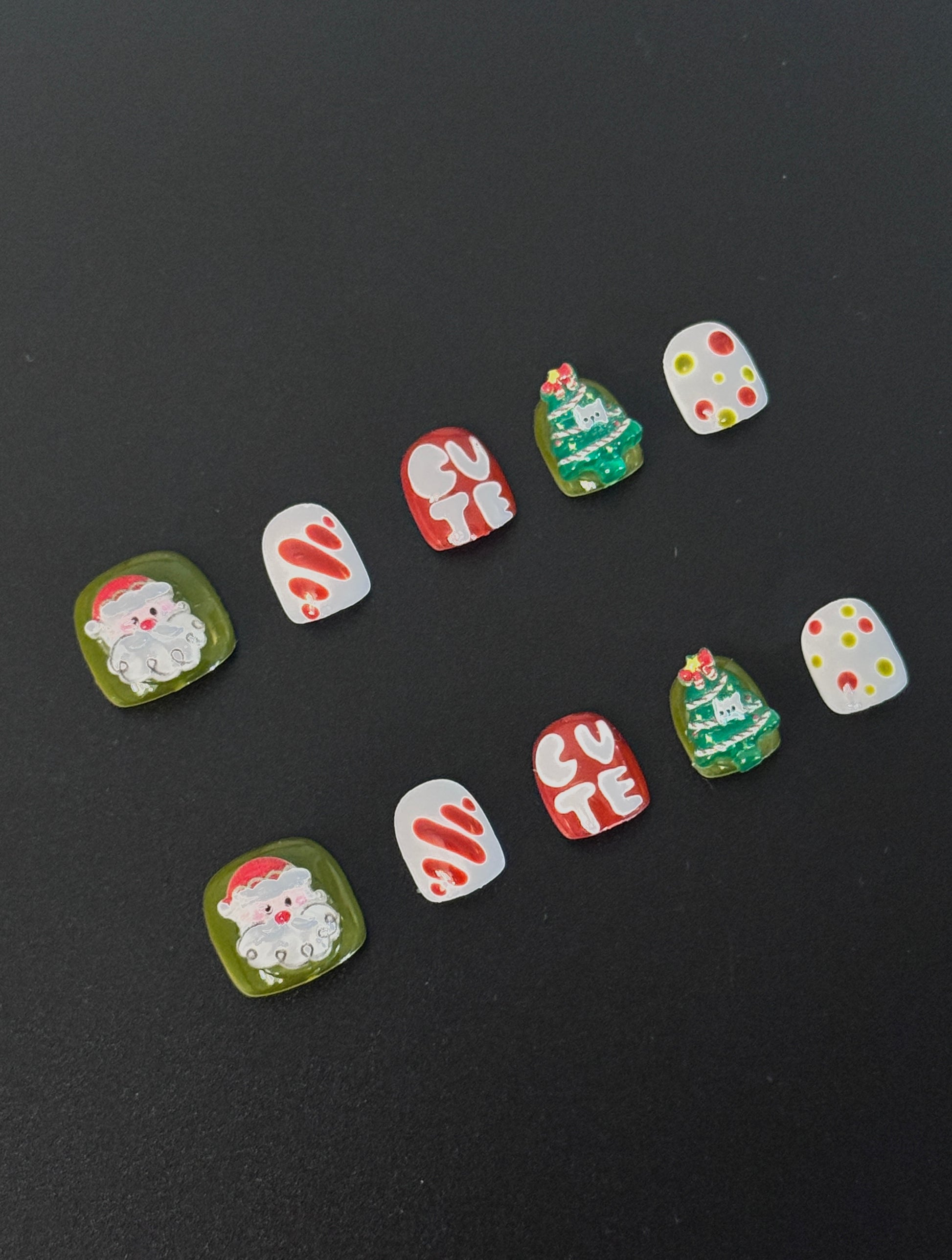 This adorable Christmas Baby Press-On Nail Set features Santa, snowman, holiday bells, Christmas trees, and festive polka dots — all in a soft, child-friendly shape.