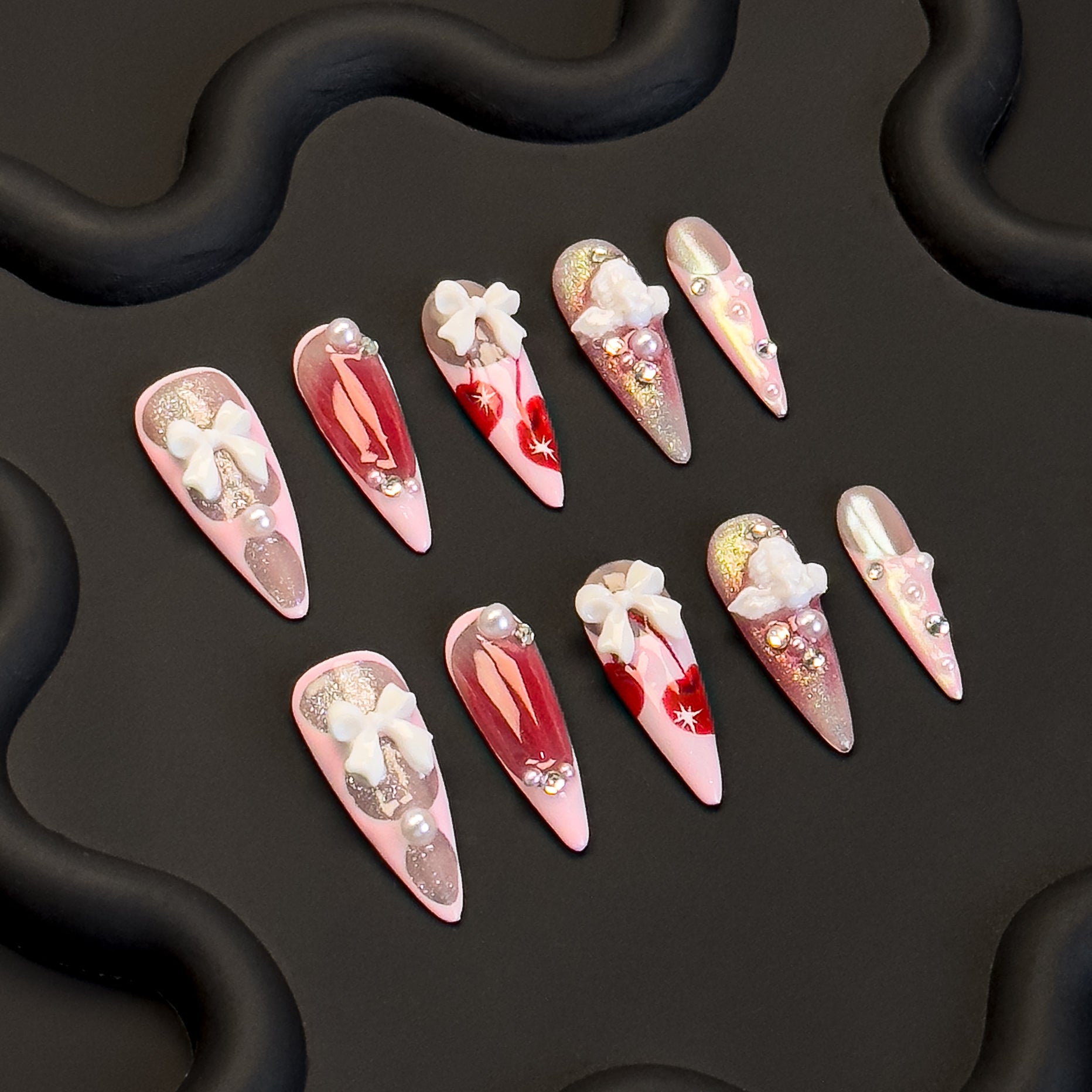 This glamorous press-on nail set features a juicy blend of cherry red, gold shimmer, and soft pink. Embellished with 3D bows, hearts, and rhinestones, each nail captures a playful Y2K aesthetic with a luxurious twist. Perfect for a bold statement look—whether it’s date night or girls’ night out.