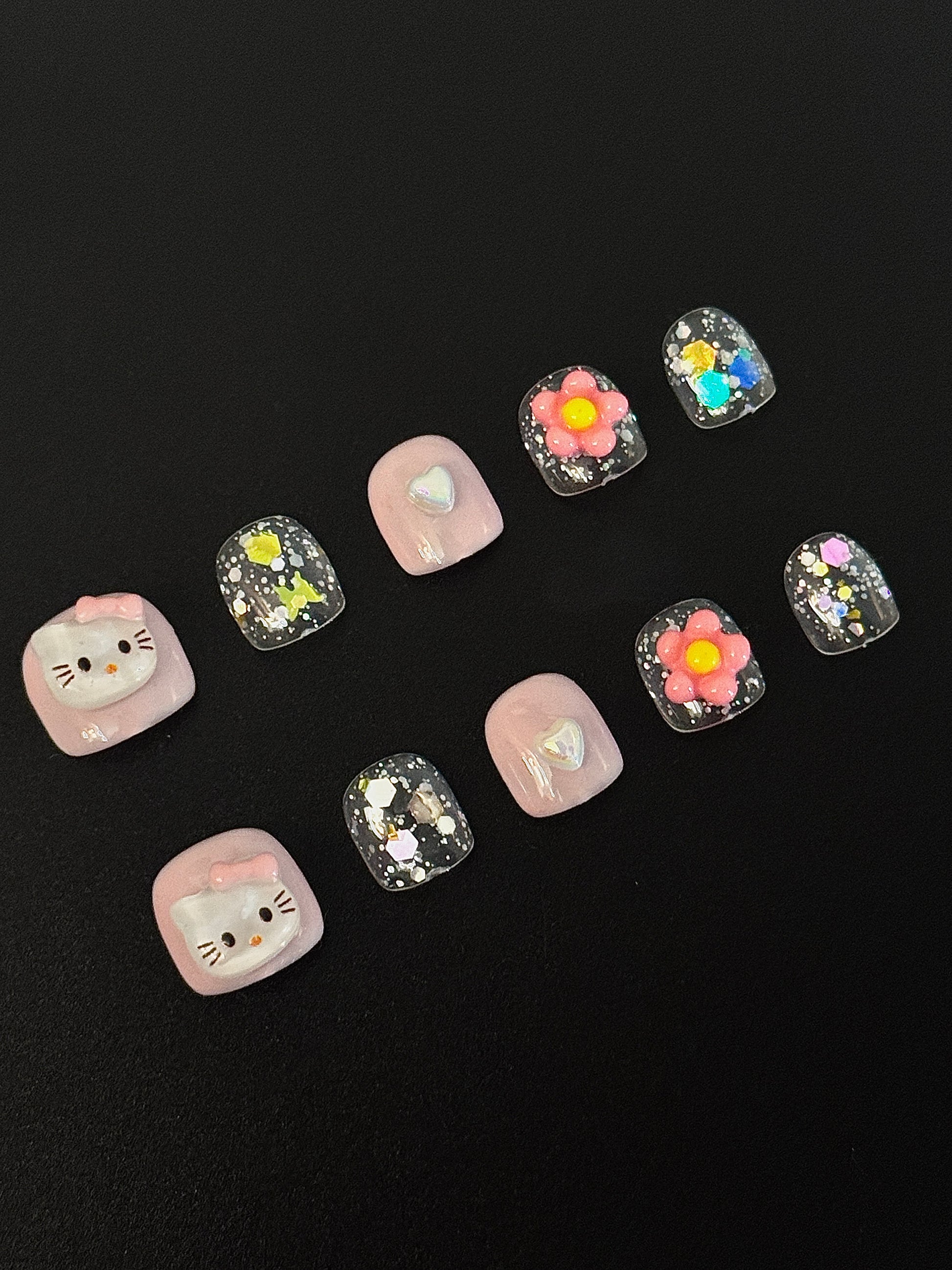 A soft and dreamy handmade press-on nail set featuring Hello Kitty 3D charms, pink flower accents, and sparkling glitter nails.