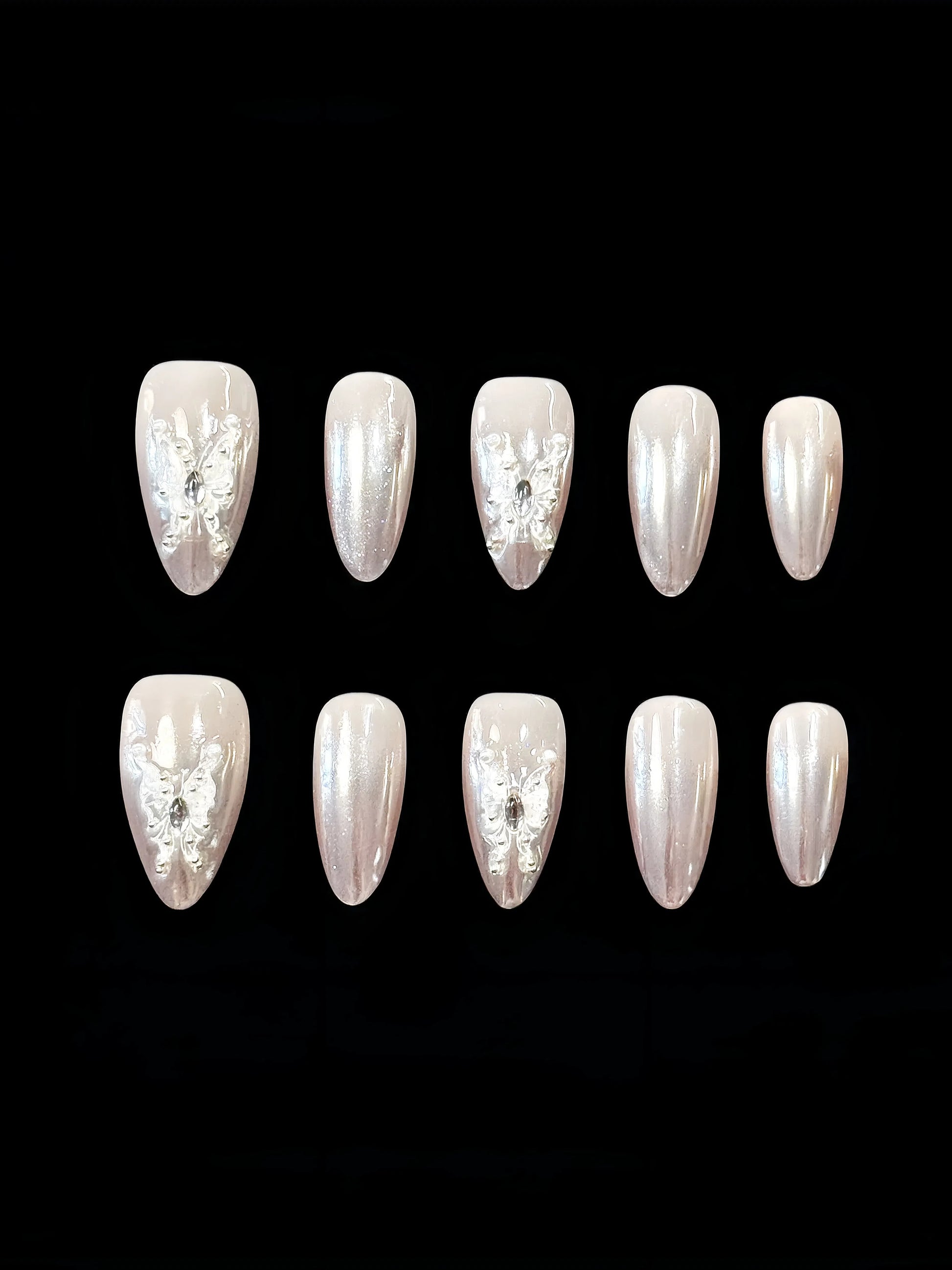 This enchanting set features a soft nude chrome base with a stunning pearlescent sheen. Intricately hand-decorated with butterfly accents and delicate rhinestones, these press-on nails bring elegance and sparkle to your fingertips. Perfect for weddings, date nights, or any occasion where you want to shine with subtle charm.